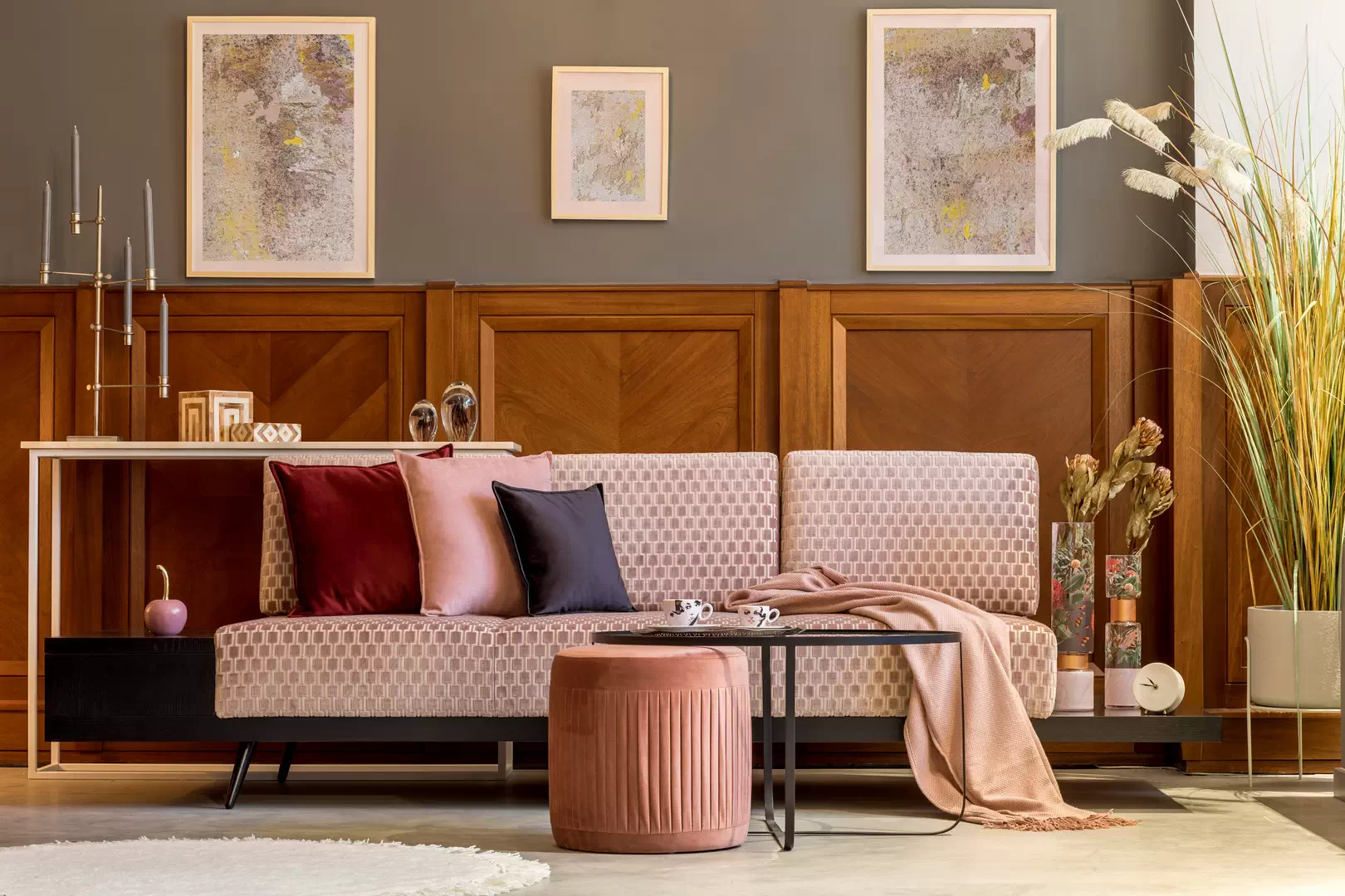 Уличная мебель перебралась в дом, а в качестве декора используются растения. Зелень может быть не только в горшках, подвесных кашпо, но и в фитомодулях или даже свисать с потолочного светильника. А ещё модно использовать растительные принты на обоях и в обивке мебели.