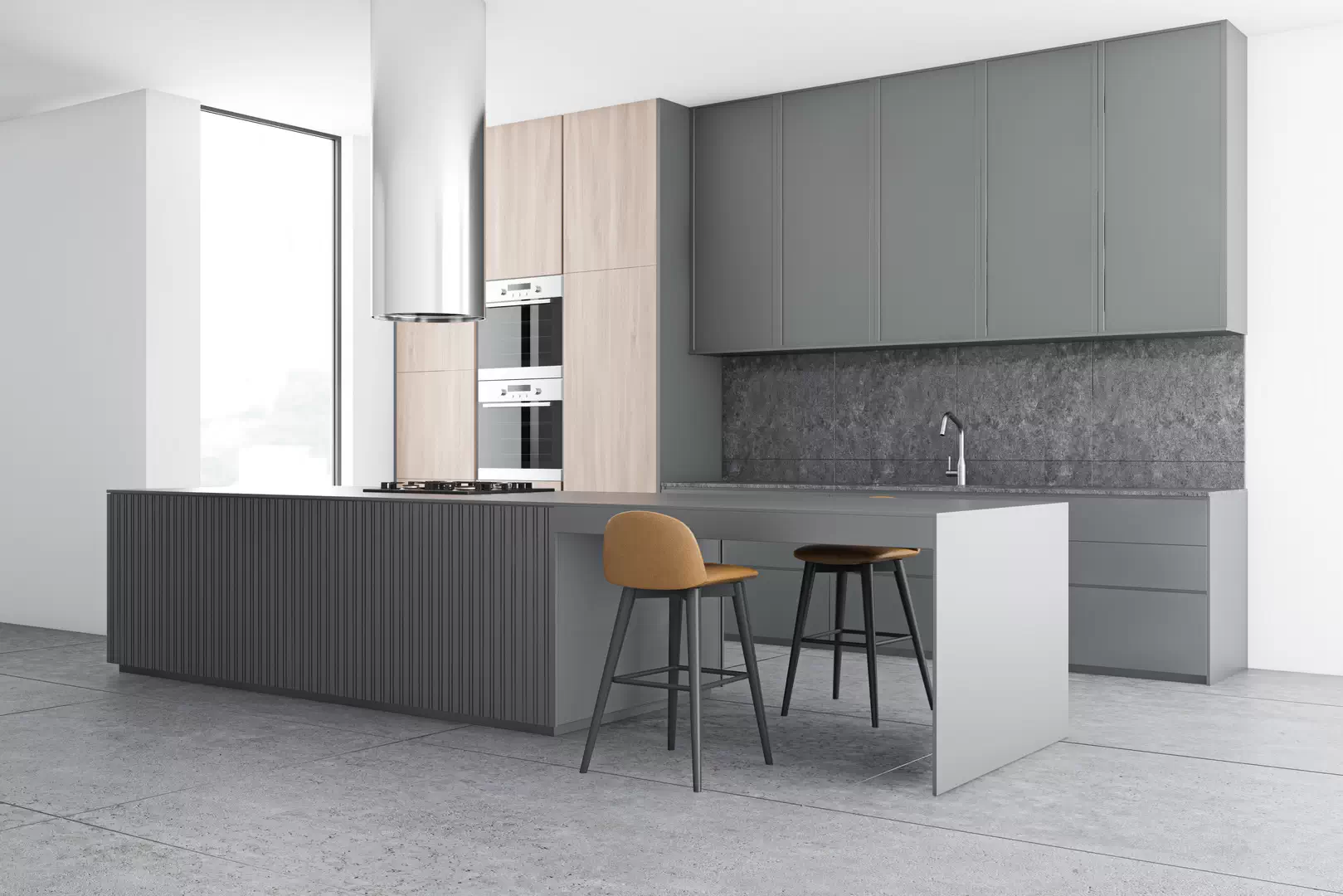 Нейтральный серый и его оттенки в дизайне современных кухонь тоже популярны. Такой гарнитур можно дополнить чёрными линиями, светлыми тонам или деревянными элементами.