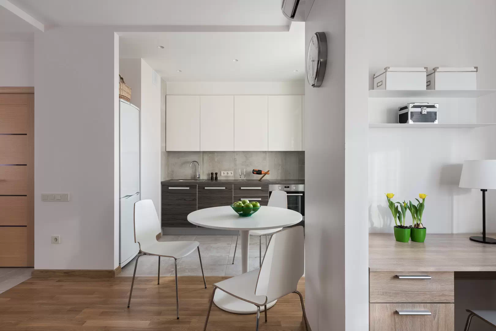 Обеденный стол может быть откидным, а стулья складываться и прятаться в шкаф или вешаться на стену. Дополнительная рабочая поверхность или даже зона для приёма пищи может выдвигаться из кухонного гарнитура.