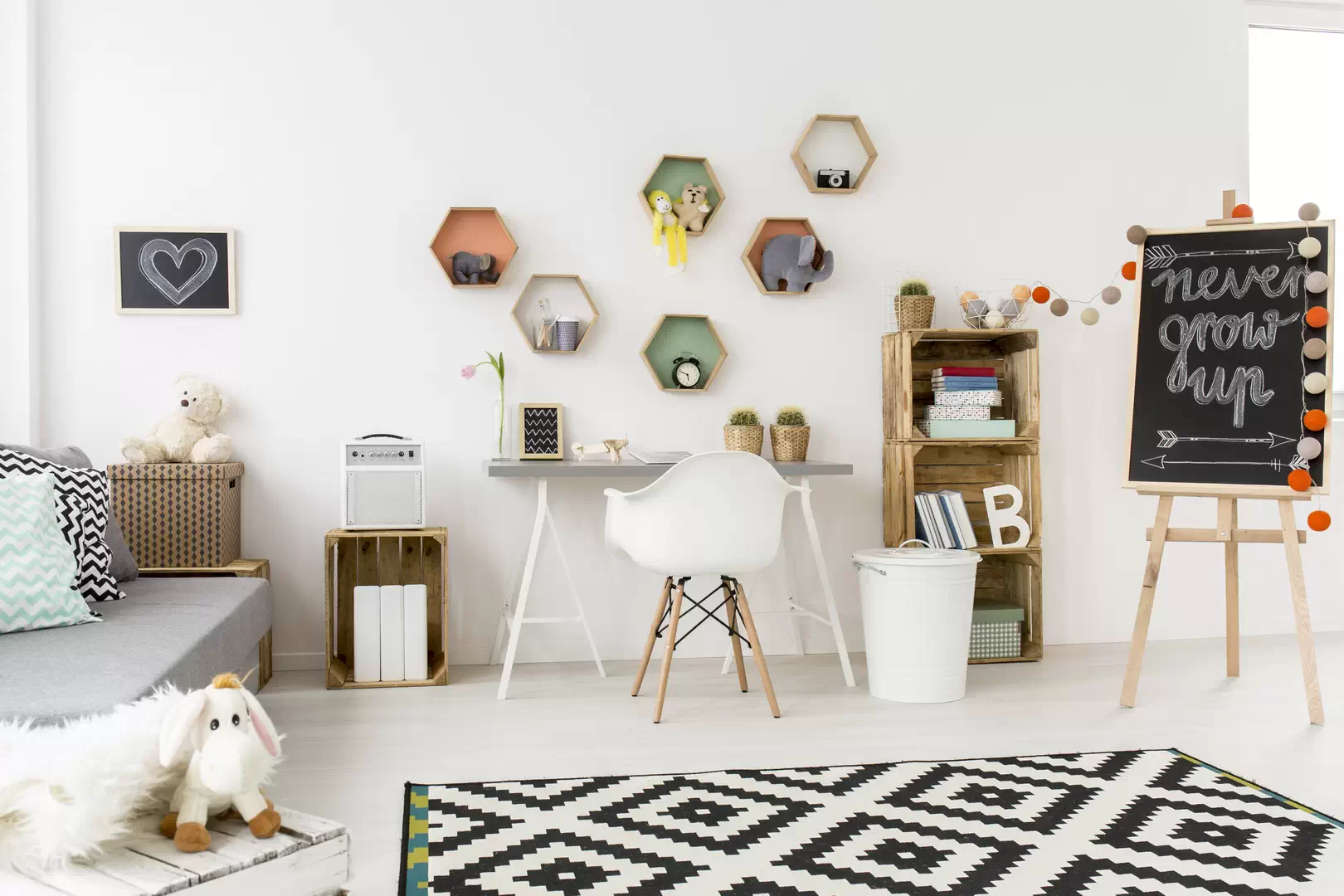Самый беспроигрышный вариант. Минимализм в обстановке. Светлые стены, белая и/или серая мебель (может быть с деревянными вставками) плюс яркие акценты в декоре.