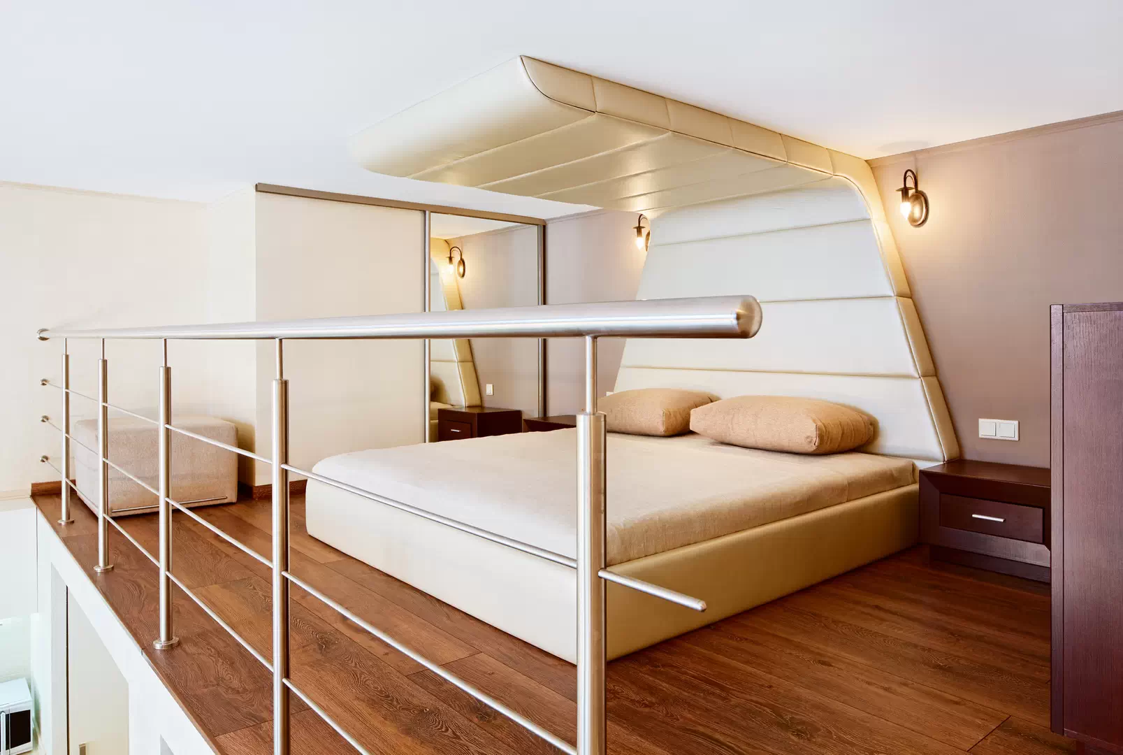 В спальне поставили массивную кровать с кожаным изголовьем, переходящим на потолок. С обеих сторон разместили прикроватные тумбы из тёмного дерева. Гарнитур дополнили комодом.
