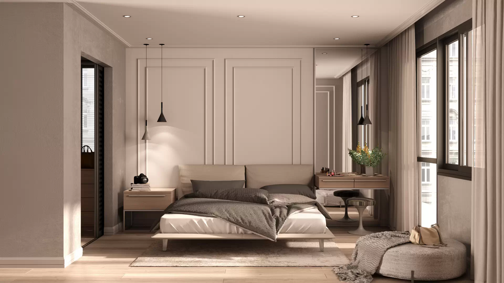 Сама спальня выполнена в стиле неоклассика. Стены покрасили в насыщенный бежевый, задекорировали молдингами. Потолок тоже бежевый – натяжной со встроенными спотами. На полу ламинат под светлое дерево. Прикроватную тумбу и навесной туалетный столик выполнили в одном дизайне. У окна установили широкое зеркало в пол. Вместо классических торшеров или бра использовали современные подвесные светильники. Кровать выбрали на тонком основании с мягким изголовьем.
