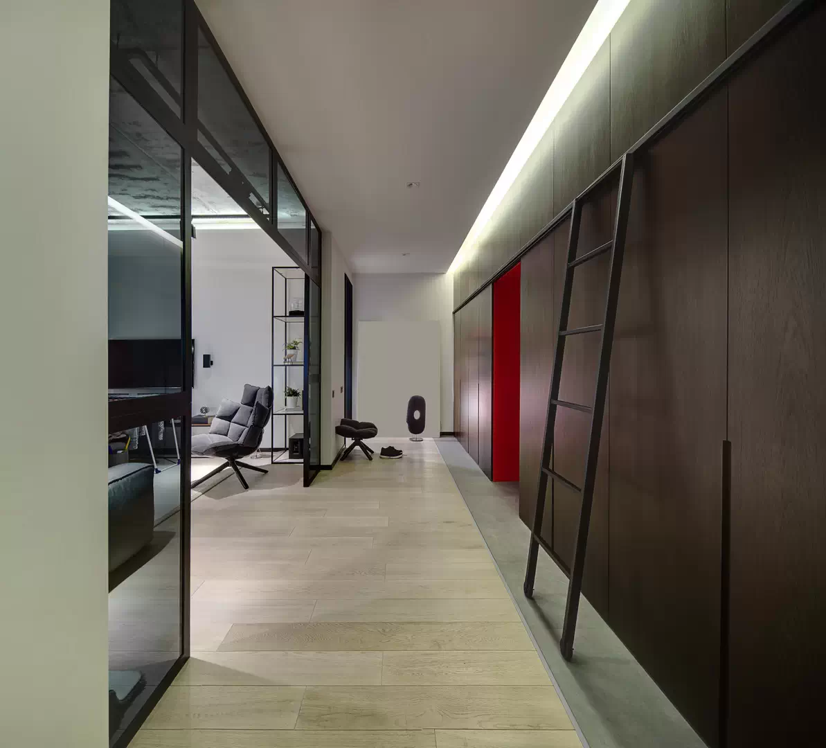 Все вещи хозяев жилья можно разместить в высоких шкафах, которые заняли всю стену. Чтобы дотянуться до антресолей, вдоль гардероба закрепили металлическую рейку, на которую опирается лестница на колёсиках.