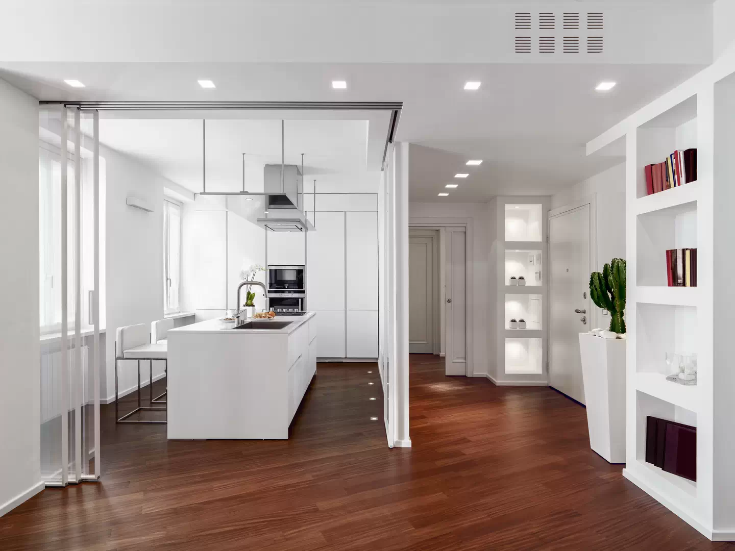 Чтобы оставить больше воздуха и простора, в этой квартире решили отделить кухню от гостиной раздвижной стеклянной перегородкой. Холодильник, духовой шкаф и микроволновку встроили в высокие шкафы-пеналы. Мойку и газовую варочную поверхность вмонтировали в остров с барной стойкой.