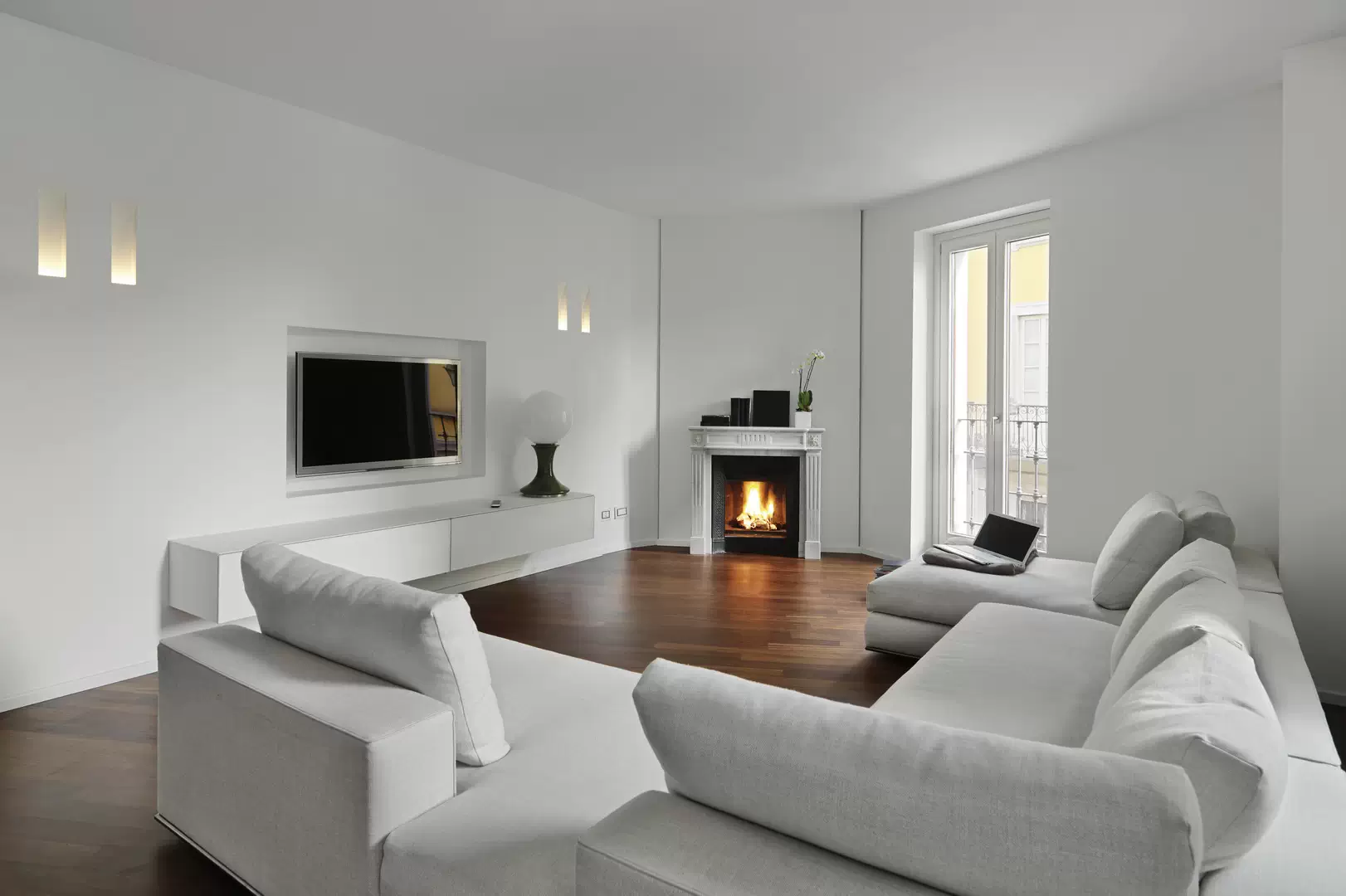 Квартира выполнена в стиле минимализм. Стены покрасили в белый. Пол контрастный – из тёмного красного дерева. Мебель белая, крупногабаритная: большой диван с чёткими геометрическими формами и прямоугольная подвесная тумба под ТВ. В нишах из гипсокартона разместили предметы декора, телевизор и встроенные светильники. Разбавили строгий интерьер камином в классическом портале.