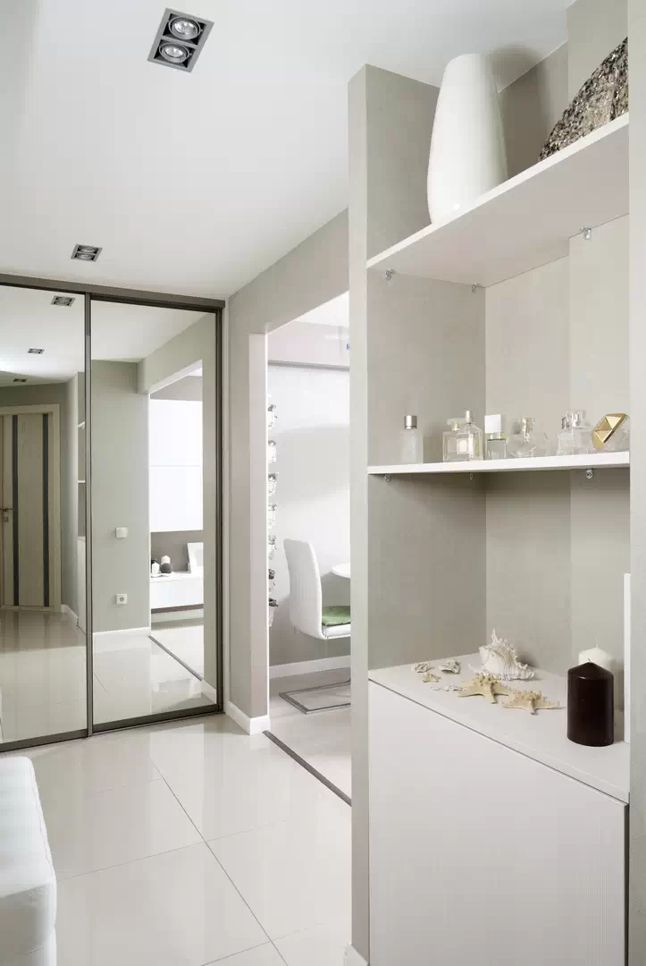 Решили между прихожей и комнатой не устанавливать дверь и оставить большой проём, чтобы визуально расширить пространство. У входа разместили зеркальный шкаф-купе, на двух соседних стенах организовали неглубокие открытые и закрытые полки.