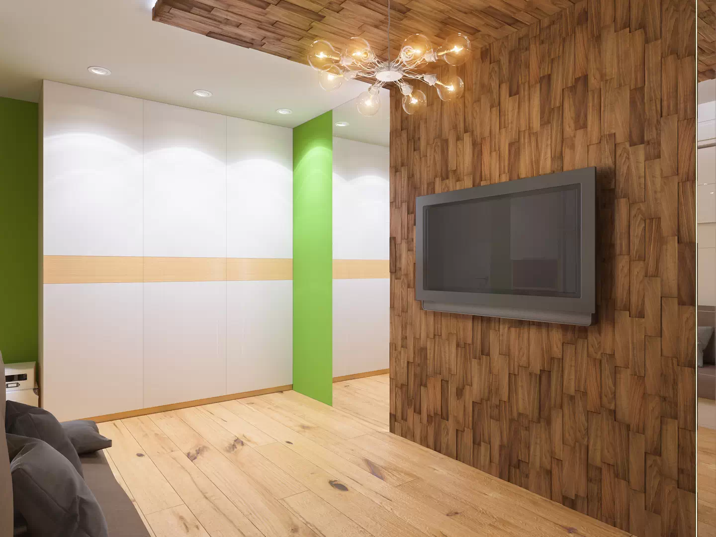 Сделать помещение шире помогли зеркала, расположенные по обе стороны от зоны телевизора. Её задекорировали деревянными плашками. Конструкция перетекает на потолок, что добавляет помещению сложности.
