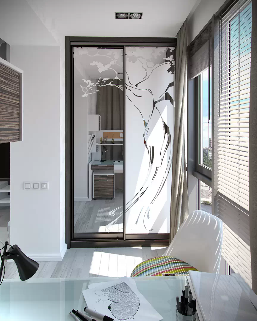 2. В лоджии можно хранить вещи. Здесь оборудовали вместительный шкаф-купе. Это помогло разгрузить комнату и сделать её просторнее.