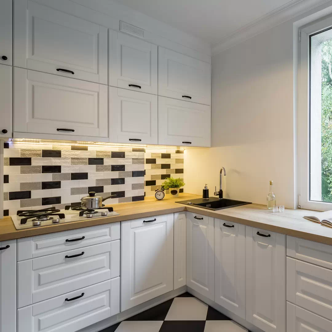 Дизайн кухонного гарнитура выполнен в стиле неоклассика. Фасады матовые белые, столешница деревянная. Мебельные ручки в цвет с раковины и бытовой техникой.