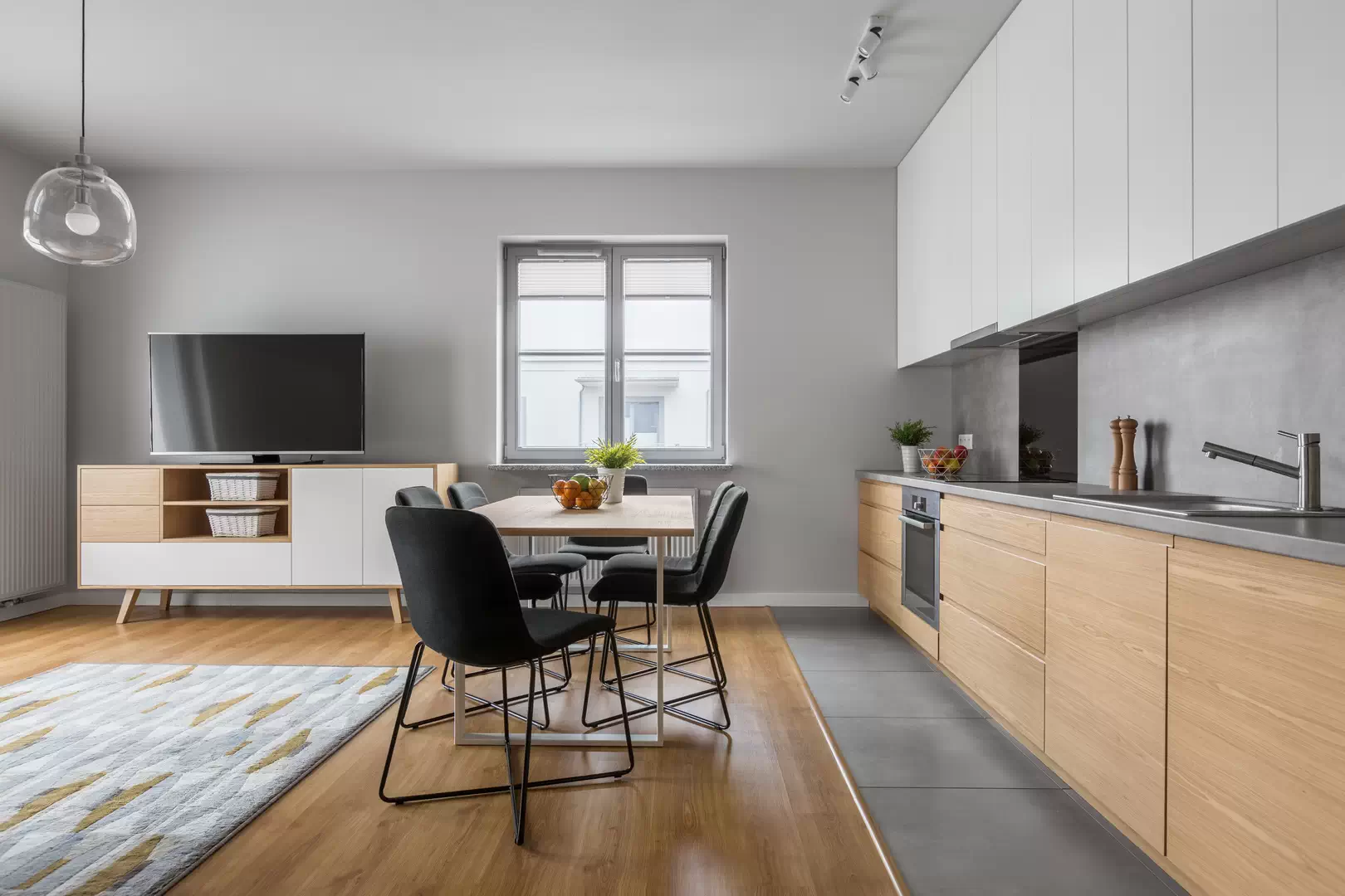 Стены покрыли светло-серой декоративной штукатуркой. Потолок подвесной белый. На полу ламинат тёплого оттенка дерева, а в кухонной зоне – керамическая плитка под бетон.