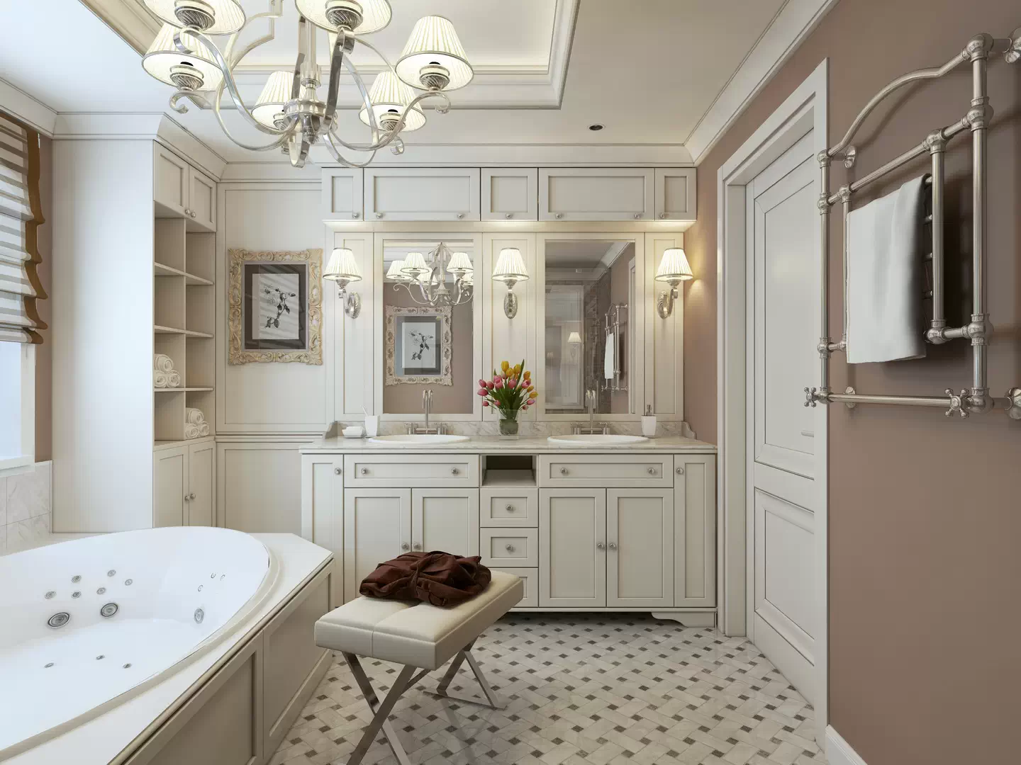Для этого проекта ванную комнату сделали по-настоящему роскошной. Для санузла в классическом стиле изготовили элегантный светлый мебельный гарнитур, состоящий из большой тумбы для двух раковин, антресоли, стеновых панелей и двух шкафов. В зоне умывальников разместили два зеркала и три бра.